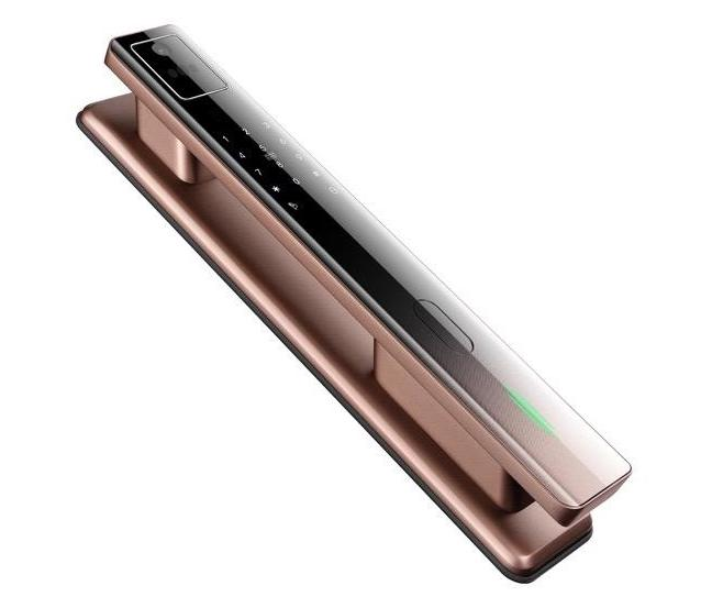 Біометричний смарт-замок із вбудованим відео-оком та функцією FACE-ID, виготовлений з якісних матеріалів для встановлення на масивні вхідні двері.
